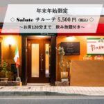 - 12月&1月期間限定。飲み放題付きサルーテコース。人気のピザ付、サラダにシャルキュトリー&前菜ほか、おつまみ充実!全7品。お席の滞在時間は120分。ノン・アルコ… 続きを読む: 12月&1月期間限定。飲み放題付きサルーテコース。