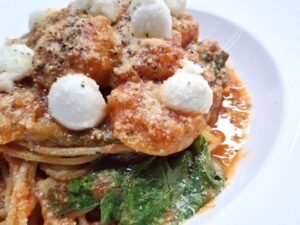 海老とカリフラワーのトマトソース。 カリフラワーのほっくりした味わいと海老のうまみをトマトソースのほんのりした酸味が引き立てます。
