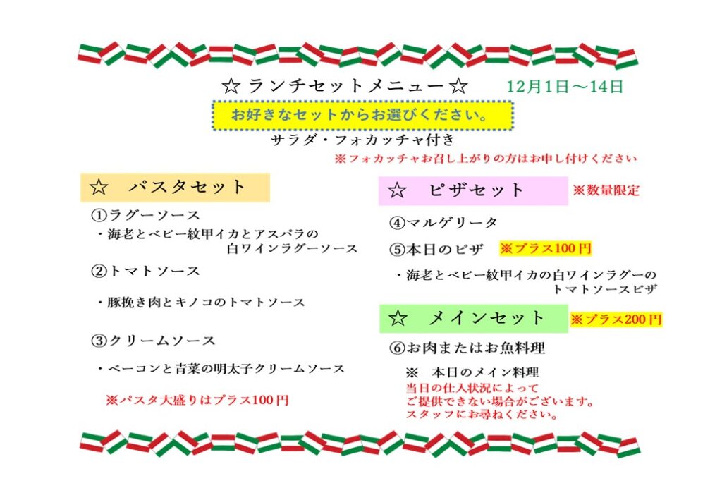 12月1日からのランチです。 2025年11月30日 最終更新日時 : 2025年11月30日 bambino_writer 海老とベビー紋甲イカとアスパラの白ワインラグーソース 豚挽き肉とキノコのトマトソース ベーコンと青菜の明太子クリームソース マルゲリータ 海老とベビー紋甲イカの白ワインラグーのトマトソースピザ FacebookXBluesky