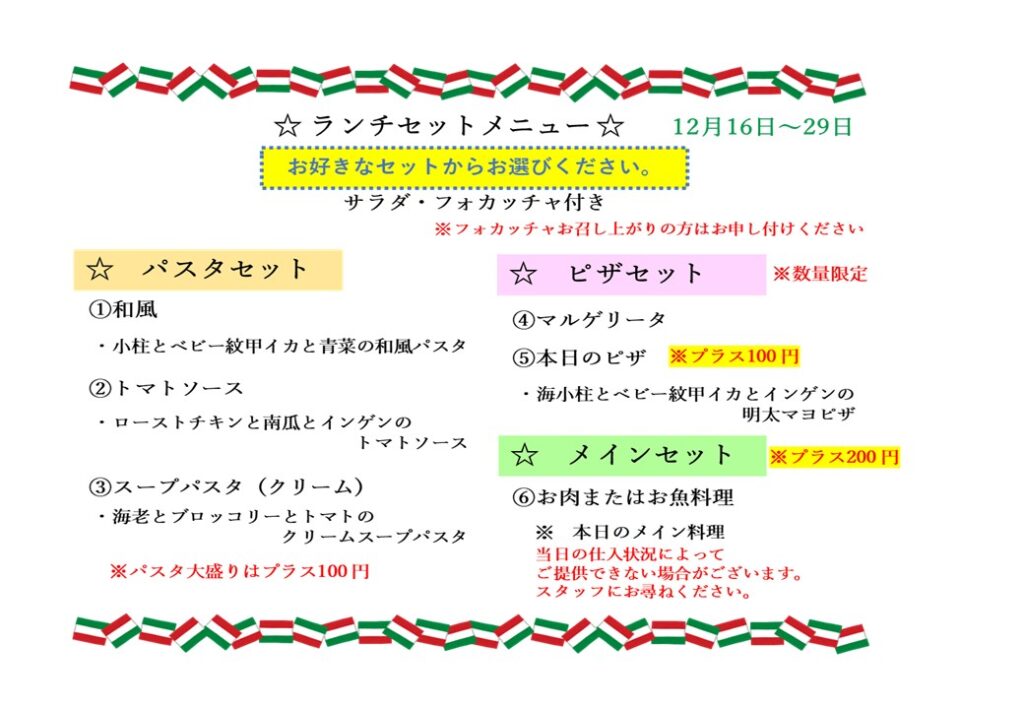 12月16日からのランチです。 2025年12月15日 最終更新日時 : 2025年12月15日 bambino_writer 小柱とベビー紋甲イカと青菜の和風パスタ ローストチキンと南瓜とインゲンのトマトソース 海老とブロッコリーとトマトのクリームスープパスタ マルゲリータ 小柱とベビー紋甲イカとインゲンの明太マヨピザ FacebookXBluesky