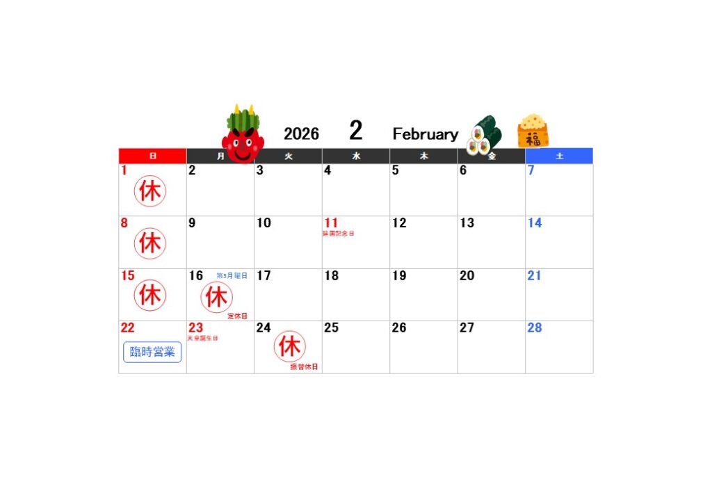 2月カレンダー。 2026年1月30日 最終更新日時 : 2026年1月30日 bambino_writer 16日(月)は、第3月曜日で定休日です。22日(日)は、臨時営業いたします。24日(水)は、振替休日とさせて頂きます。 FacebookXBluesky