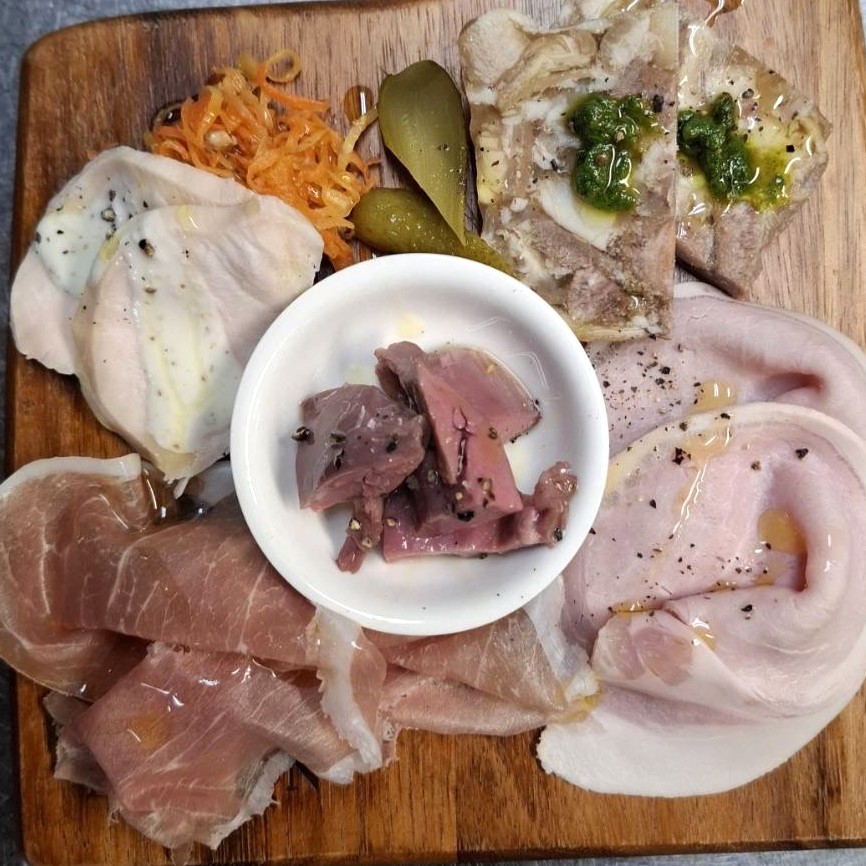 手前左から右に、生ハム、アマニ豚のロースハム、コッパロマーナ(豚の煮こごり)、