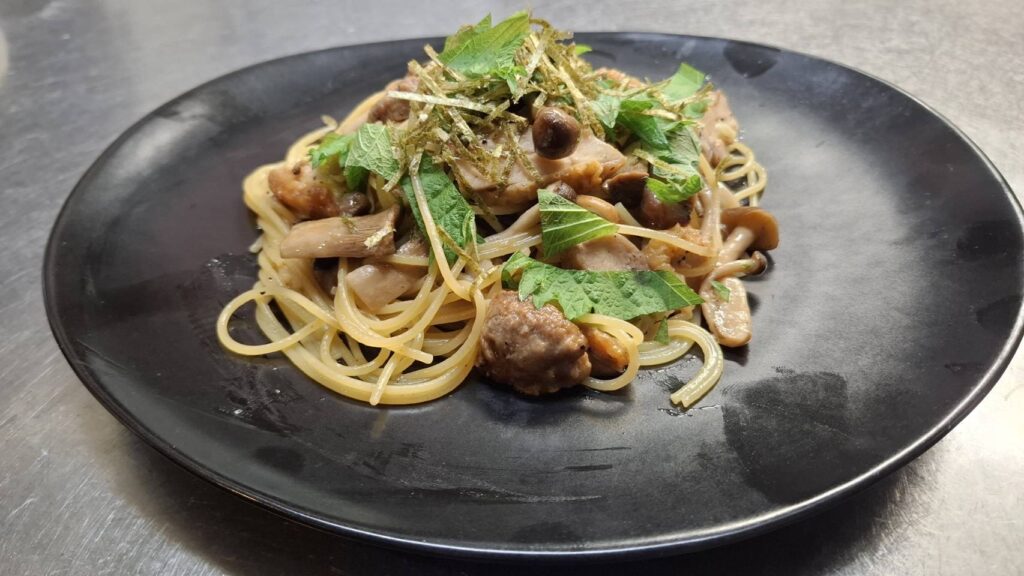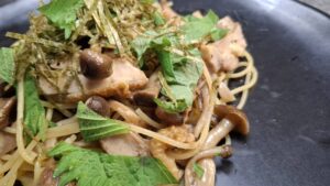 ローストチキンとキノコと大葉の和風パスタ
