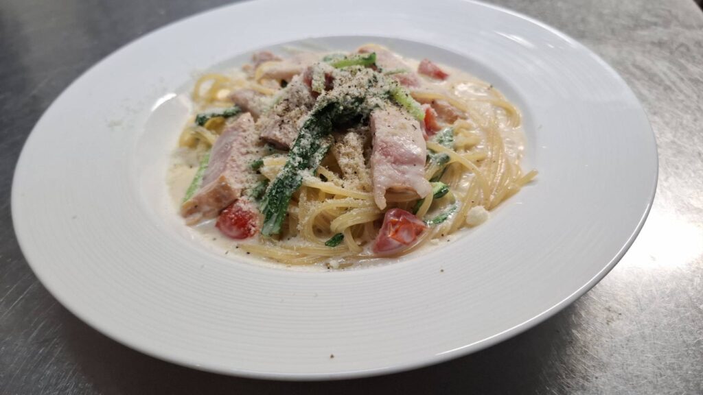 ベーコンと春菊とフレッシュトマトのクリームソース