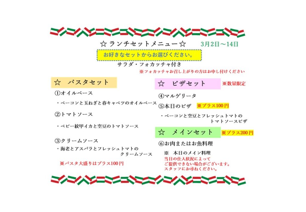 3月2日からのランチです。 2026年3月1日 最終更新日時 : 2026年3月1日 bambino_writer ベーコンと玉ねぎと春キャベツのオイルベース ベビー紋甲イカと空豆のトマトソース 海老とアスパラとフレッシュトマトのクリームソース マルゲリータ ベーコンと空豆とフレッシュトマトのトマトソースピザ FacebookXBluesky