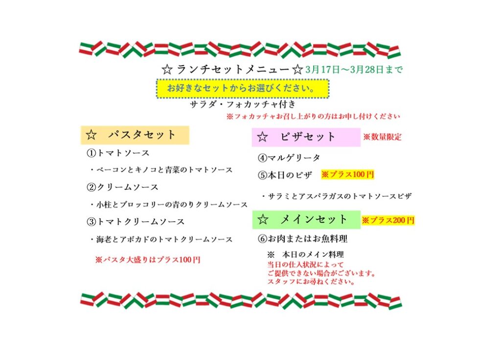 3月17日からのランチです。 2026年3月15日 最終更新日時 : 2026年3月15日 bambino_writer 3月16日(月)は、第3月曜日で定休日です。 ベーコンとキノコと青菜のトマトソース 小柱とブロッコリーの青のりクリームソース 海老とアボカドのトマトクリームソース マルゲリータ サラミとアスパラガスのトマトソースピザ FacebookXBluesky