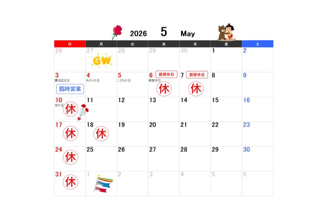 5月カレンダー。 2026年4月28日 最終更新日時 : 2026年4月28日 bambino_writer ゴールデンウィークは、29日(水)昭和の日~5日(火)こどもの日まで、休まず営業いたします。6日(水)振替休日と7日(木)は、振替でお休みさせていただきます。日曜日と第3月曜日は定休日です。 シャンパンコルクの武者人形 FacebookXBluesky